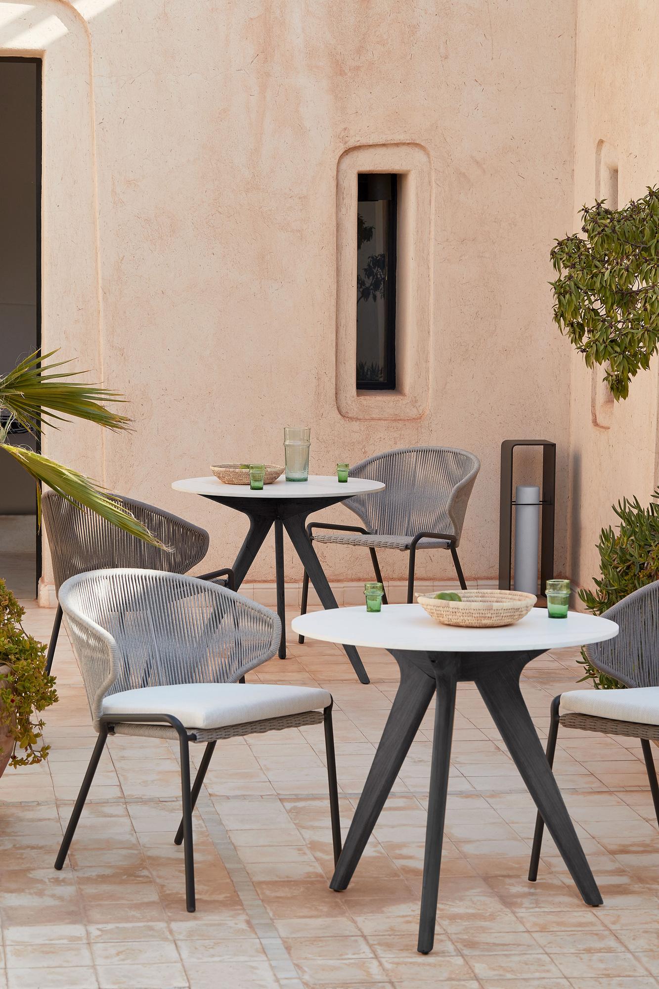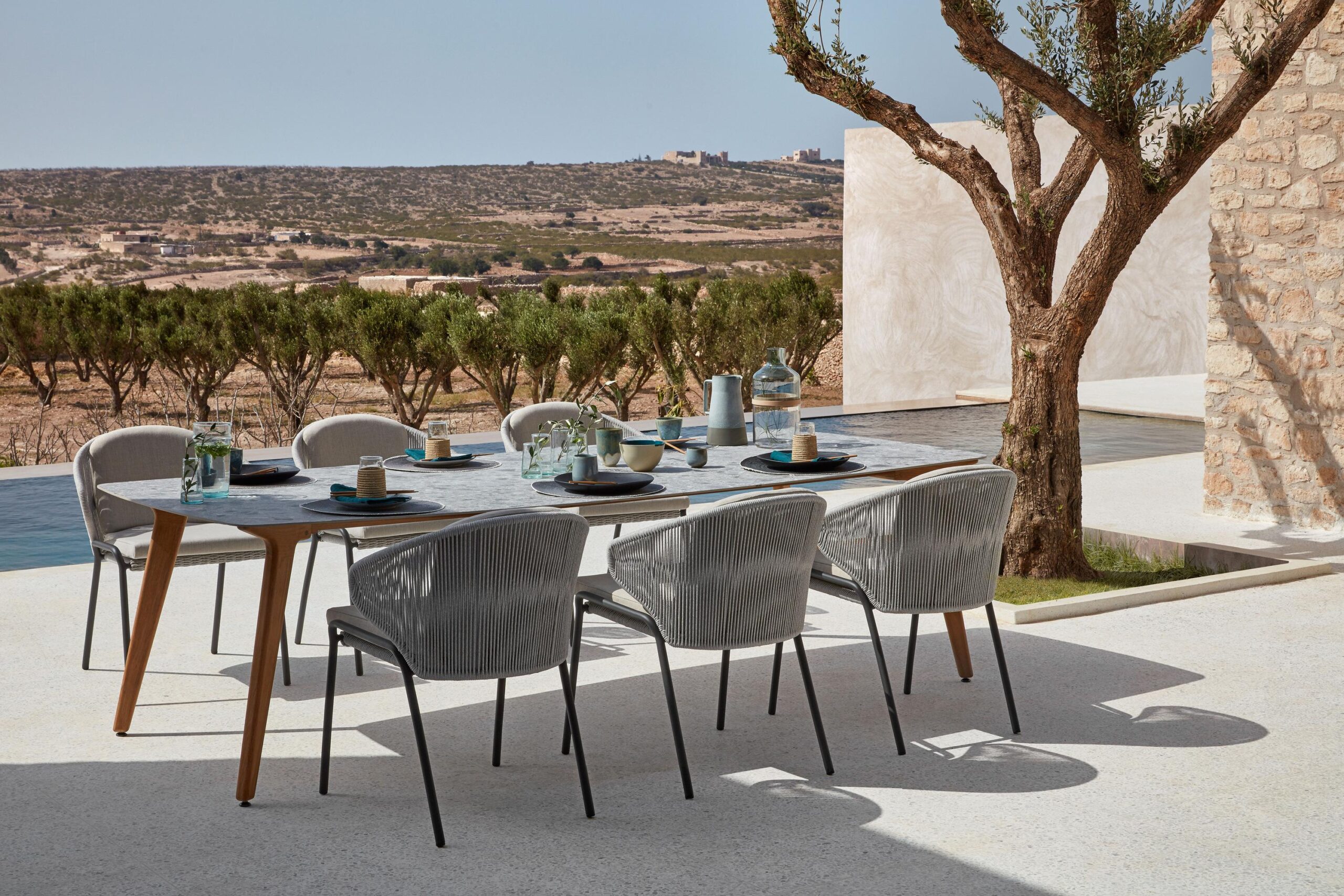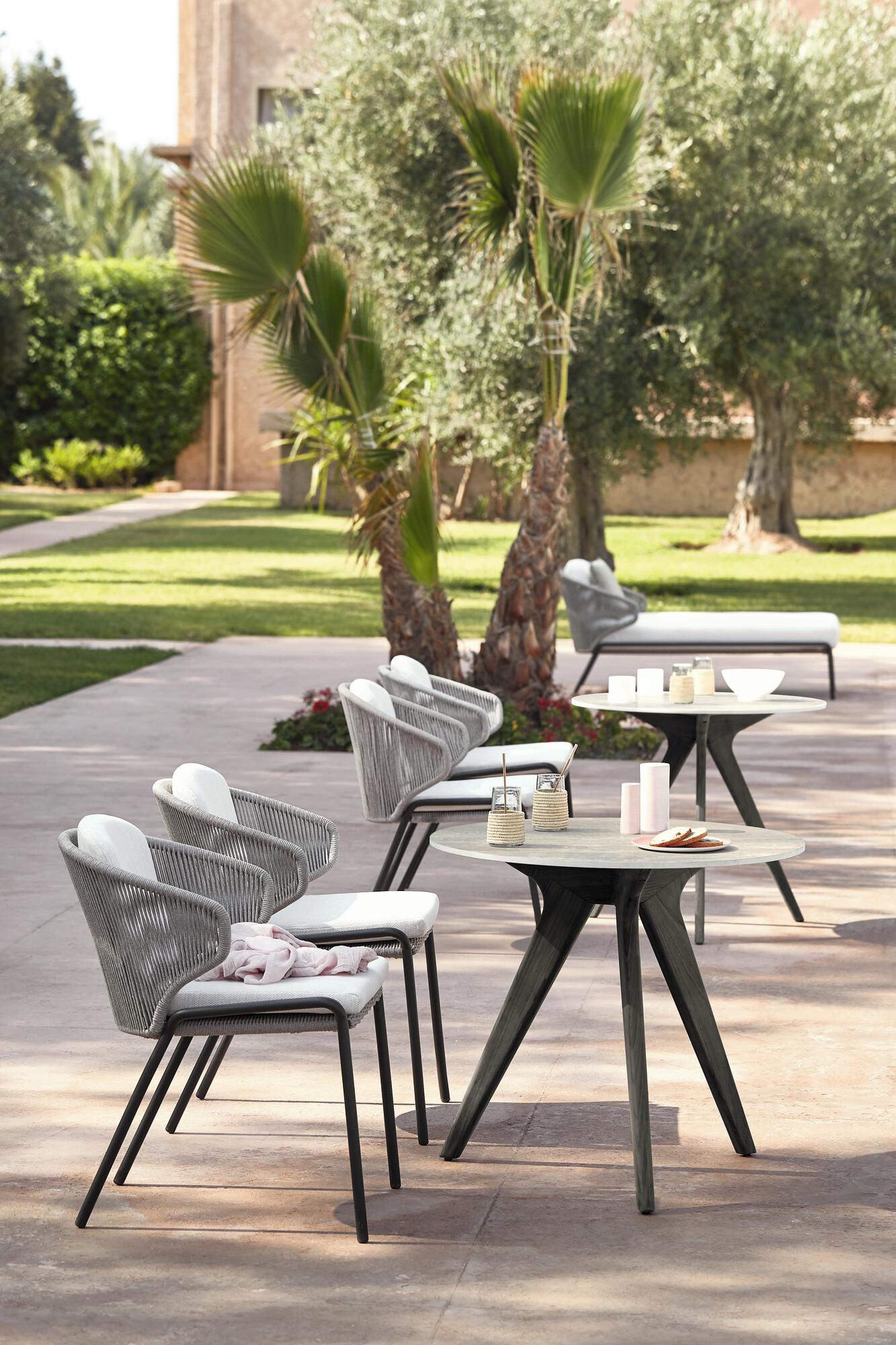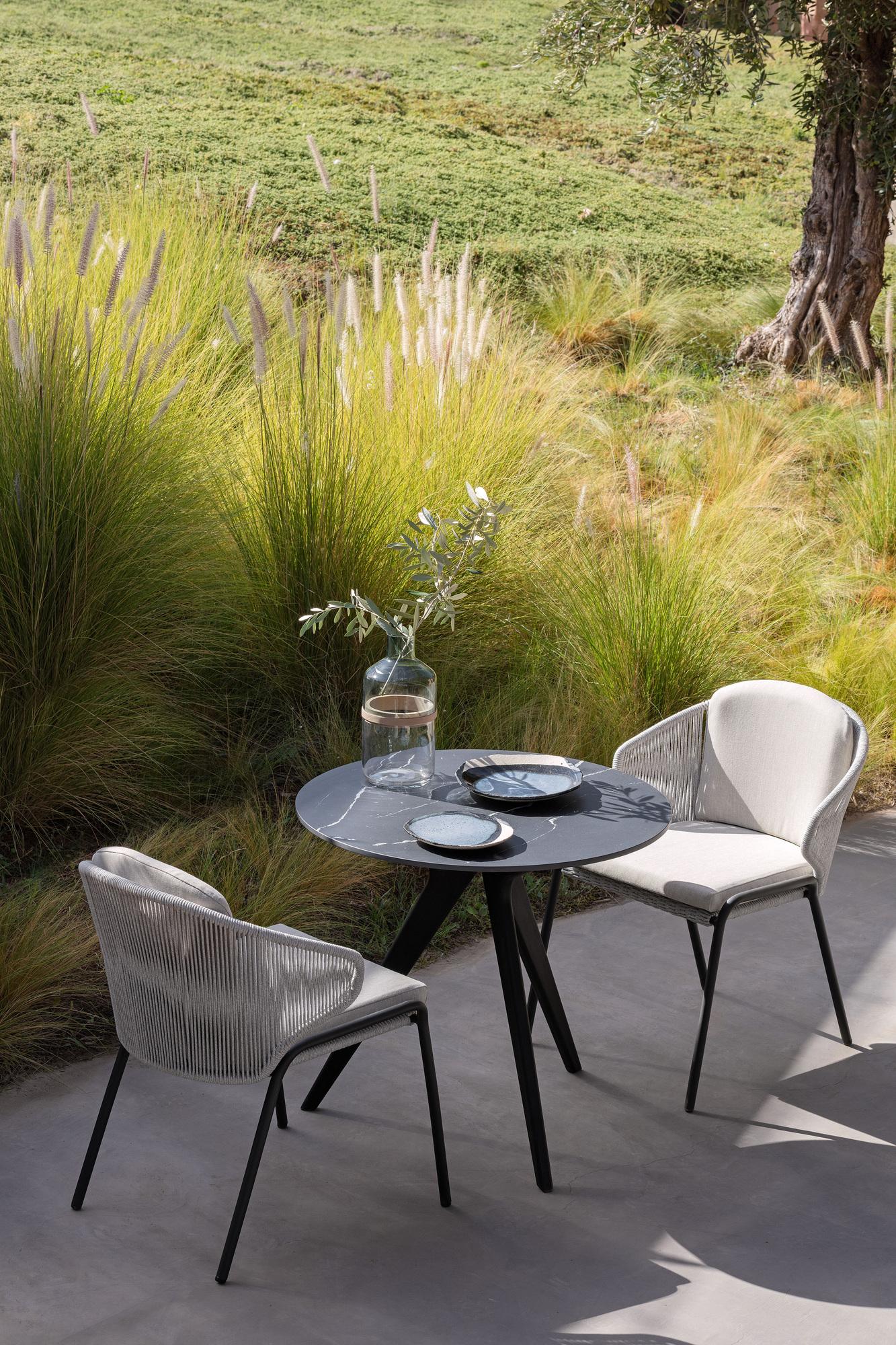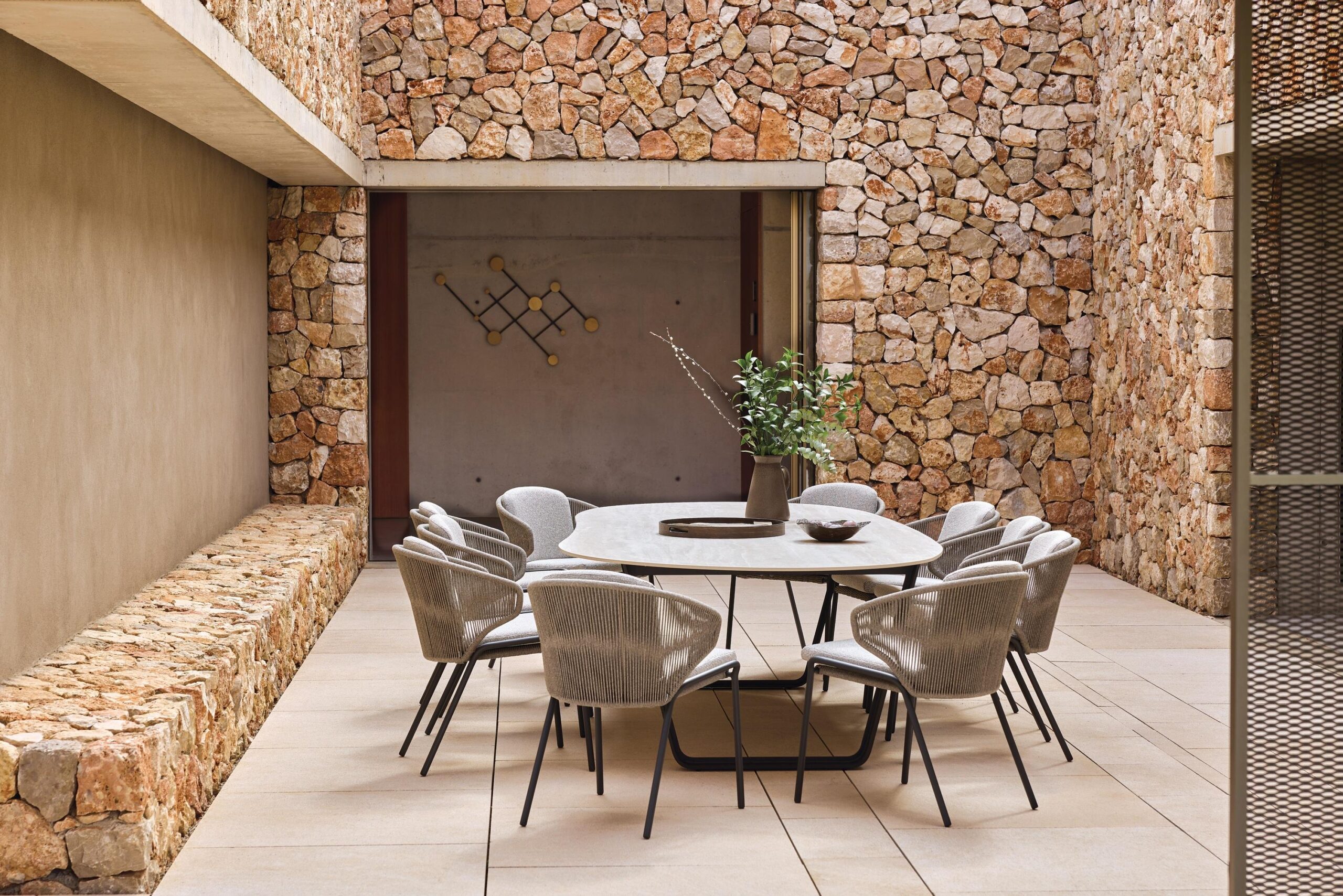 An L-shaped seating arrangement with a central table, ideal for corner spaces in gardens or patios. It offers ample seating while maximizing space efficiency.