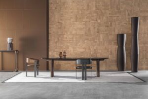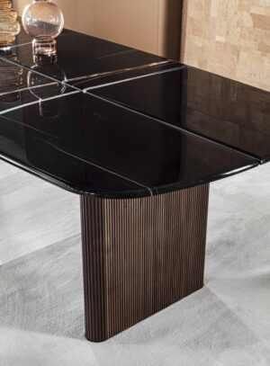 A modern interpretation of symmetry and contrast, the Solace Table pairs a clean black base with a soft-veined marble top for a timeless dining statement.